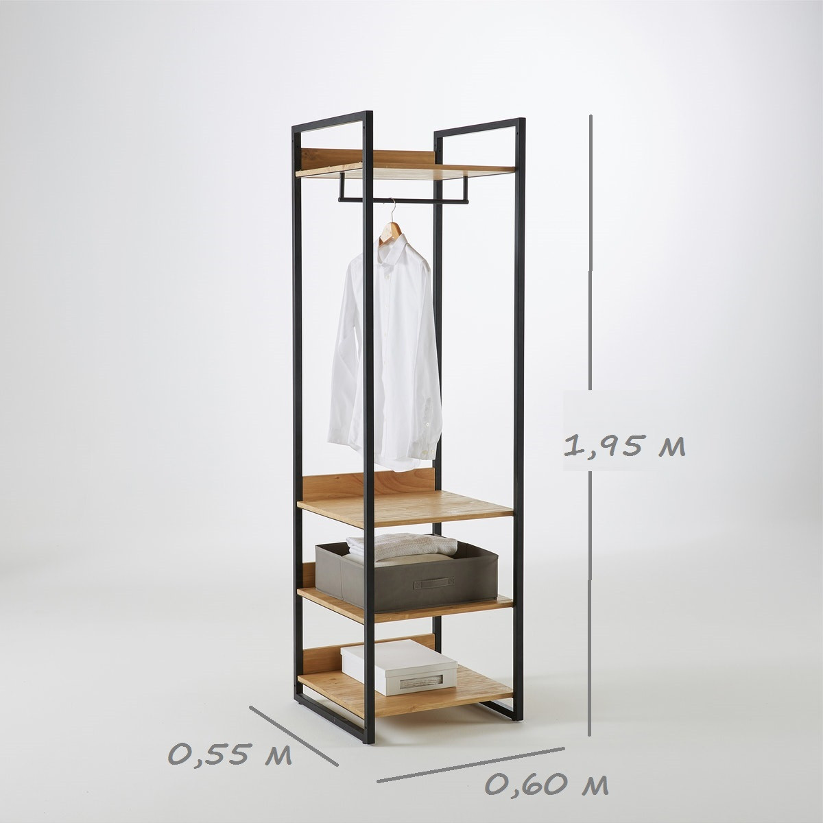 Зроблений із надійного металевого профілю 20*20 мм, товщина стінки 2 мм. Має рейл для одягу, полицю для взуття та чотири полиці для супутніх речей. Конструкція максимально міцна та стійка.